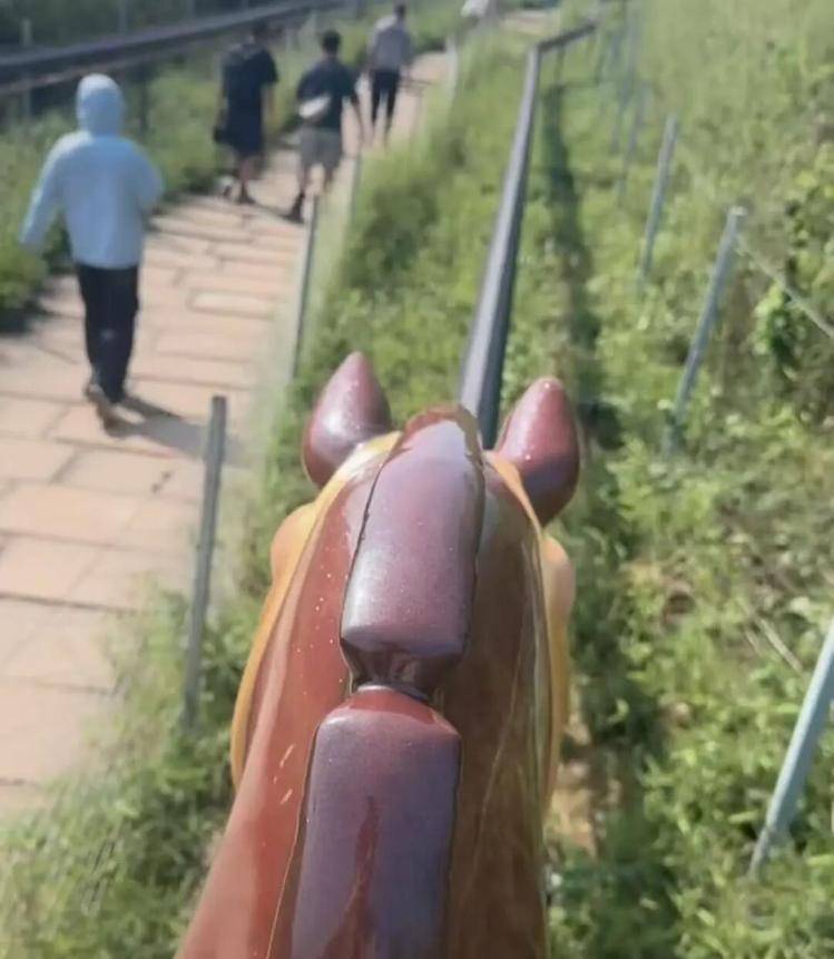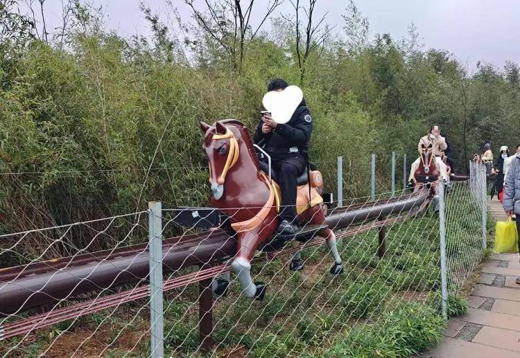 视频画面里,游客所乘坐的并非活体马匹,而是木马,设备沿固定轨道缓慢滑行,节奏十分舒缓。其他网友的视频显示,该游乐项目名为“丛林骑士”。