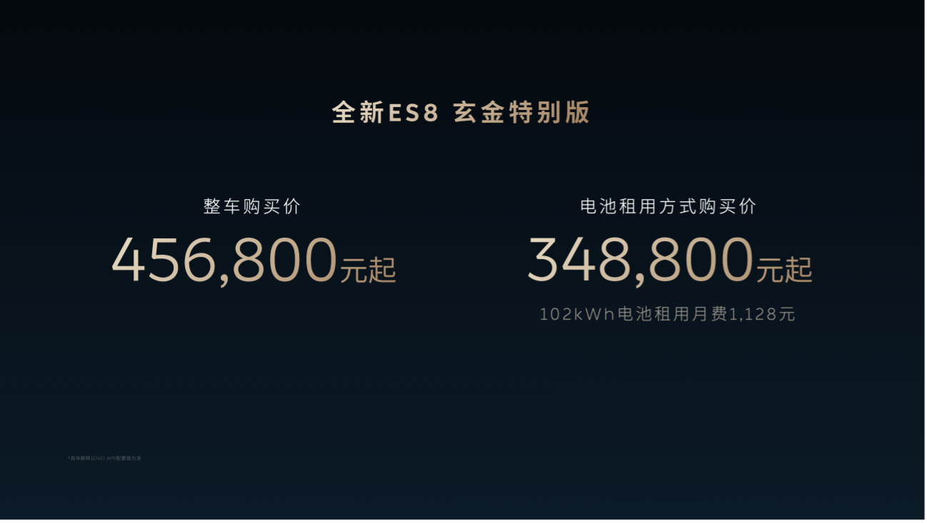 在北京车展的蔚来展台上,全新 ES8 玄金特别版完成公开首秀并正式开启上市发售,新车整车购买价格为 45.68 万元,采用 BaaS 电池租用方案的购买价格为 34.88 万元,对应的 102kWh 电池月租用费用为 1128 元,具体配置信息以蔚来 APP 配置器为准。作为基于 6 座签名版打造的特别版车型,这款车的核心亮点在于专属设计与配置的优化,进一步强化了全新 ES8 的商务属性与精致感。
